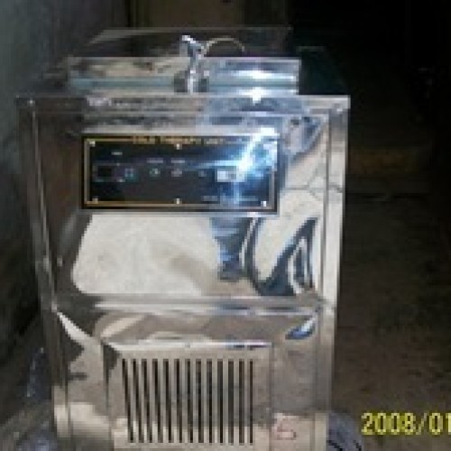 Cold therapy unit (Air chilled):unit is made of heavy gauge stainless steel sheet with well insulated top and sides. Top loading unit fitted with heavy duty cooling unit and a digital temperature indicator cum control to keep packs ready when needed. Mounted on 75mm ball bearing castors for mobility. Comes with six standard size cold packs. Finished bright inside and special paint finish outside. It completely simplifies the problem of cold therapy applications in physcial-therapy departments.